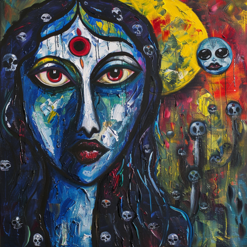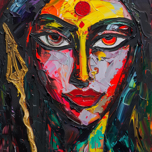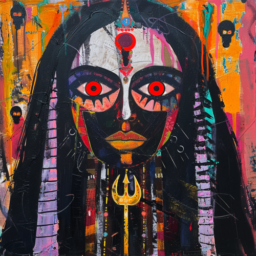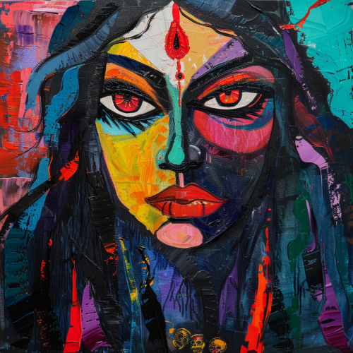 Picasso style cubism pop art painting of goddess Kali in all her finery. Her long hair is open and flowing. Her black skin shines against bright Marko Rothko style shading. She has a large powder textured vermillion bindi on her forehead. Her red kohl lined eyes are large but not angry. She should look proud and smiling. She has a golden coloured trident in her hand. Her black saree has small skulls printed on it. Oil painting. palette knife. --v 6.0