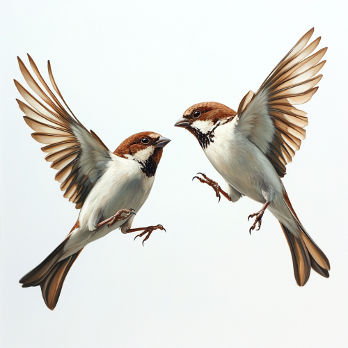 realistic set of only two sparrow birds flying with each other, they are suspended in the air, with a clear white sky behind them, the birds are suposed to be intercating in a dramatic fight, each one of them represent light and darkness respectively, painted by raphael or michalengelo, realistic oil painting