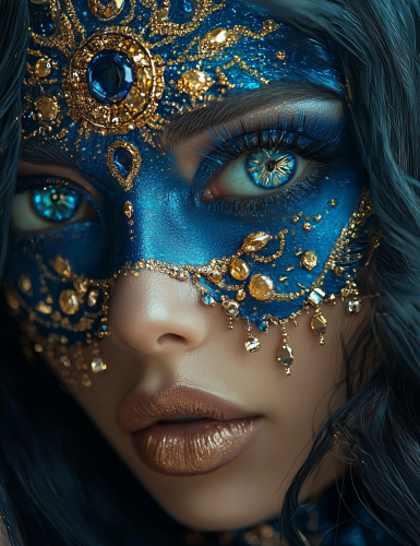 Portrait of a beautiful young woman, AI goddess creative face painting, blue and gold, surreal, intricate details, gems, big eyes, long hair, beautiful lips, futuristic background --ar 2588:3375 --v 6.1 --q 2