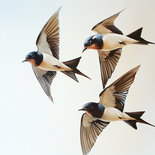 realistic set of swallow birds flying with each other, they are suspended in the air, with a clear white sky behind them, painted by raphael or michalengelo, realistic oil painting,