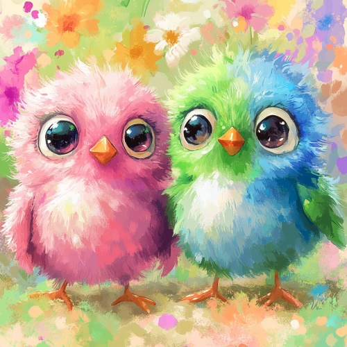 oil painting digital art three adorable fluffy birds with big eyes, each a different color: pink, green and blue. They stand side by side, and bright flowers are in the background. The overall feel is playful and cute, with birds that look expressive and friendly, making it look like an illustration from a colorful, fun cartoon or children's book. There are also elements in the form of confetti, which add a festive and joyful atmosphere.