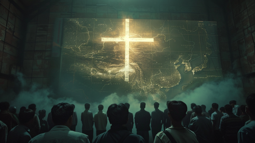 dramatic scene with a dark, moody lighting, featuring a map of the Korean peninsula prominently in the center. Surrounding the map, people from various backgrounds are standing together, holding hands in a united gesture. Above them, a radiant cross glows with a bright, warm light, symbolizing hope and faith. The contrast between the dark surroundings and the glowing cross creates a powerful, inspirational atmosphere. The overall composition highlights unity and spiritual connection in the quest for peace. --ar 16:9 --v 6.0