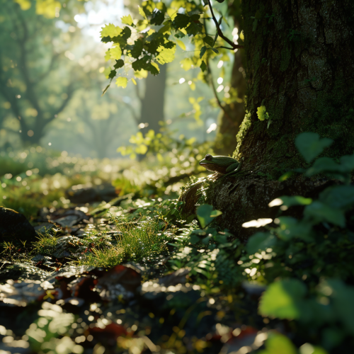 scene from a adventure game, tree in a forest, frog perspective, shadowplay, unreal engine 5 --v 6.0