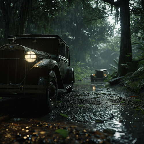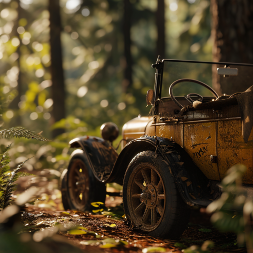 scene from a adventure game, old ford t tuning car in the forest, close-ups, shadowplay, unreal engine 5 --v 6.0