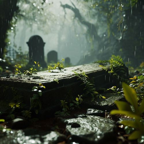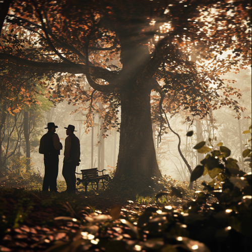 scene from a adventure game, two mafiosi talk about a tree in the forest, shadowplay, unreal engine 5 --v 6.0