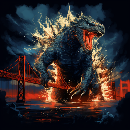 graffiti art style illustration of godzilla in the san francisco bay, angry, working on his computer, ready to fight, dark cloudy night with a bright moon, very high detail, dark indigo and red color --v 5.2