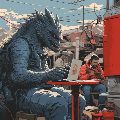 very high detail illustration of godzilla sitting on a bus in the mission district in san francisco, working on his laptop, there's a man in the foreground who is also working on his laptop and giving godzilla instructions, peaceful, dark indigo and red colors, cloudy day, graffiti on the sid of a building --v 5.2