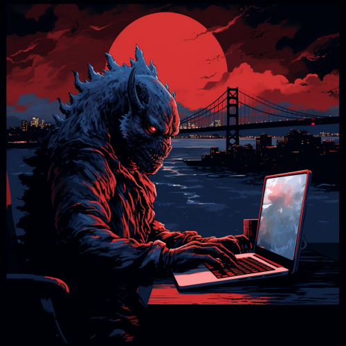 graffiti art style illustration of godzilla in the san francisco bay, angry, working on his computer, ready to fight, dark cloudy night with a bright moon, very high detail, dark indigo and red color, very intense, sinister look, high contrast --style raw --v 5.2