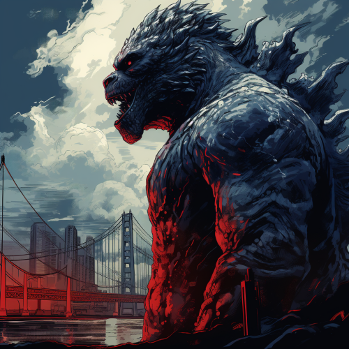 very high detail illustration of godzilla wandering through san francisco, he's looking down at a man who can help him solve his problem, peaceful but dramatic, high contrast, red and dark indigo colors, cloudy day, graffiti art, sutro tower in the background --style raw --v 5.2