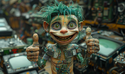 happy thin, no arms or legs, tattoos, flowing green hair, circuit board body, thumbs up with his thumb, in the style of the looney tunes --ar 5:3 --s 750 --v 6.0