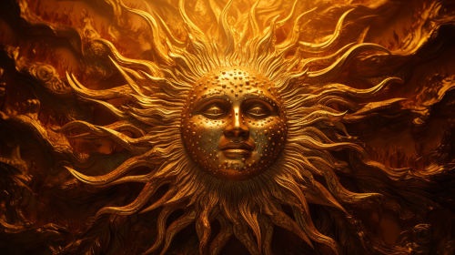 an oil painting, illustration, mahabharat character surya putra karna with mustache and long hair and heavy body, with a yellow glowing sun symbol in the middle of chest, sitting on ground and doing meditation in windy air, sun in a background --ar 2:3