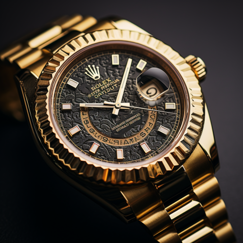 Studio photography of an arm in white porcelain with a rolex watch on his wrist. The hand is floating above a solid grey background. This is a product shot, captured in the style of Mario Testino using a Canon EOS R5 camera and Kodak Portra Pro 400 film.