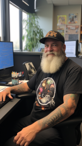 A black man standing in a confident and intense pose. He is DARK SKINNED AND has close cut, fine silky hair. He has a beard and detailed tattoos on his neck and hands ONLY! His edge up is sharp and perfect. He is wearing a gold watch on his wrist and Cuban chain.