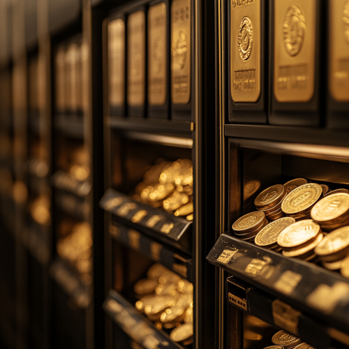 a background image that is muted so the text can appear on a website over the top of it that features the interior of a coin store that has coin vending machines distributing gold and silver