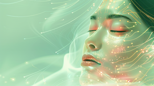A web page for a medspa AI chatbot, featuring a digital assistant with a beautiful, ethereal appearance, combining organic beauty with high-tech elements. The bot has a face with smooth, soft skin tones, with intricate gold and silver circuitry patterns that glow softly. The page background is a gradient of calming blues and greens, with soft, flowing lines representing tranquility and advanced technology. UI elements are minimalist with a touch of luxury, using gold accents and delicate fonts. hd quality, vivid style, futuristic beauty, soft lighting, luxury design --ar 16:9 --v 6.0
