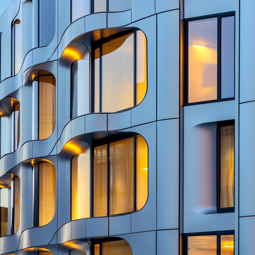 A modern urban building with a distinctive, wavy façade design. The exterior features smooth, white textured finish that gently curve between each window, creating a rhythmic, undulating effect across the surface. The windows reflect the golden light of the setting sun, adding warmth to the sleek materials. In contrast, the adjacent structure has sharp, clean lines and large windows that highlight a contemporary, geometric design. The overall scene showcases a blend of architectural innovation and elegance, set against a calm city evening