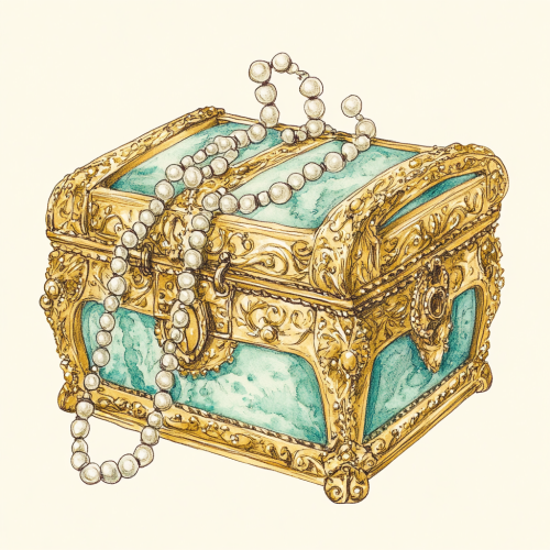 a drawing of golden treasure box with pearls and gold, vintage, in the style of baroque-inspired illustrations,hand-drawn, aquamarine color scheme, detailed