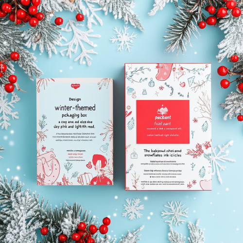 "Design a winter-themed packaging box with a cozy and elegant feel, using a baby pink and light blue color palette, accented with red. The background should be a frosty light blue, evoking a wintry atmosphere. Feature delicate snowflakes and icicles in baby pink across the surface, and add red berries and holly leaves as vibrant accents around the edges. Include subtle red and white illustrations of winter icons like snowmen, winter mittens, and gift boxes scattered gently throughout the design. The brand name should be prominently displayed in a stylish cursive font in white or light gold, with product details in red beneath it. Use baby pink accents around the borders and a thin, embossed red trim to add a touch of sophistication. The overall look should be warm, festive, and inviting, blending the cool tones of winter with playful, seasonal icons."