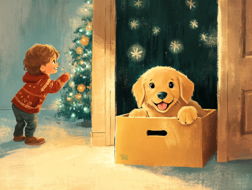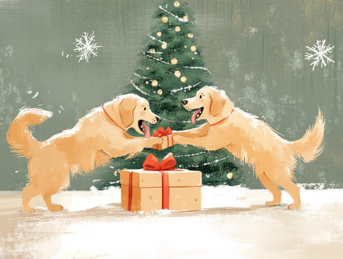 illustration of a two Golden Retriever Dogs tugging with their mouth at each end of a Christmas present box, Christmas tree behind them, drawn in the style of Oliver Jeffers, soft light, pastel colors, Christmas theme, childrens book illustation --ar 4:3 --v 6.1