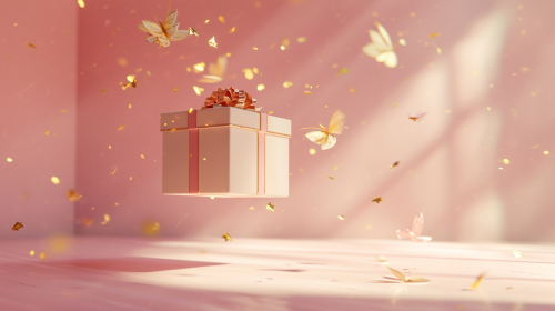 beauty store concept. A Floating gift box with golden fairies lifting it, shadow of box visible on floor, magical feeling, clean minimal background, light red, white and gold hues, photoreal --v 6.0 --ar 16:9