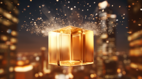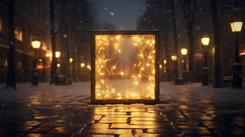 film frame, extreme close up of a golden box from which a light emanates from the box, flying in the sky in the background city lights, it's night, christmas --ar 16:9