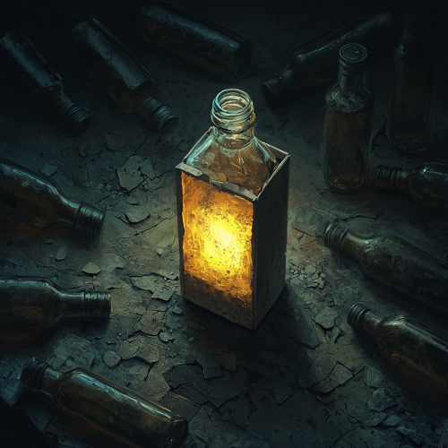 a stark contrast between broken bottles of failed treatments and a pristine, glowing box of Fungifin at the center. The scene is dark and desolate on one side, representing wasted time and ineffective solutions, while the other side is bathed in a warm, golden light emanating from Fungifin, symbolizing hope and a definitive cure. --q 2 --v 6.1
