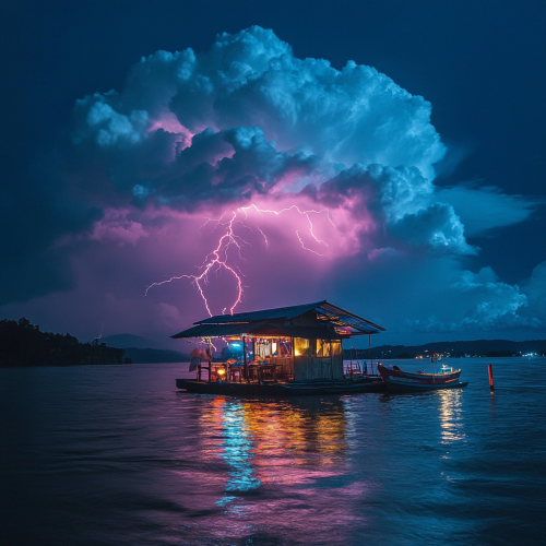 A massive thunderstorm with lightning over the Catatumbo Lightning Venezuela, illuminating an isolated floating house on the water at night. The photo was taken from behind and shows a cloud of light pink lightning striking down to the ground, creating intense sparks and highlights. In front of it is another small boat with its lights shining brightly. A dark blue sky can be seen above. There's no one around; only the river reflects the glow of neon lights. It feels peaceful yet powerful.