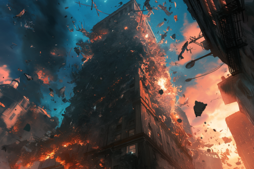 a building blowing up with rock and debris flying everywhere in a dark town during a thunderstorm + horror + art style of Capullo, Brom, Whelan, aly fell rutkowski, art germ, rossdraws, and franzzeta + art station + ultra detailed + hyper realistic + 8k --ar 3:2 --niji 6