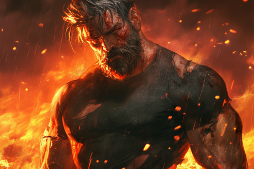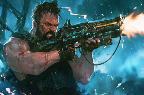muscular man with short messy black hair and beard wearing a torn t-shirt firing a machine gun during a thunderstorm + horror + art style of Capullo, Brom, Whelan, aly fell rutkowski, art germ, rossdraws, and franzzeta + art station + ultra detailed + hyper realistic + 8k --ar 3:2 --niji 6