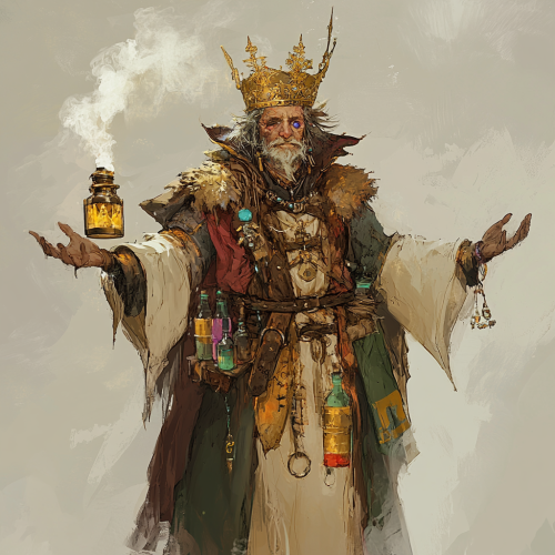 Create a straight-on, half-body portrait of a character who is a blend of a Shaman and an Alchemist, exuding a sense of awe and power. The character wears a golden crown that covers the upper half of their face, and their attire is medieval-inspired with a realistic fantasy style. Bottles of potions are attached to their clothing, and in one hand, they hold a lantern emitting smoke, adding a mystical touch. The character stands with arms outstretched, conveying a commanding presence, with an old sketch aesthetic that still maintains intricate detail.