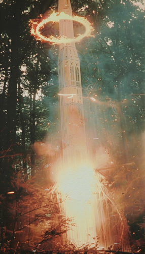 a photorealistic white tower falling in a forest at night, with a person falling from the tower, the top of the tower is on fire, a golden crown can be seen falling, Light pastel colors, ethereal light, a bit out of focus --sref 1809476652 --ar 4:7 --v 6.0 --s 250