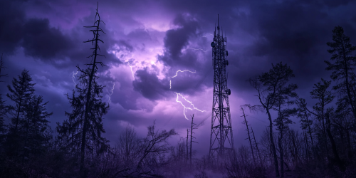 A radio transmission tower looming over a dark forest, the deadwood, thunderstorm, dead trees, deep purple sky, realistic, photograph --v 6.1 --ar 2:1
