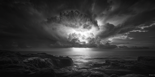 high contrast black and white photograph based on the style of photographer William Patino capturing a thunderstorm cell rolling in over the ocean, the sun is breaking through on an off centred horizon beneath a really dark clouds, Bursts of lightning in the backfround illuminating the cloud from beneath with glowing edges. The foreground only the lower 3rd of the image, it is taken low to the ground highlighting the light reflecting off of chanels carved in the rock filled with trapped pools of water, they are running from the bottom outer corners with an inward direction pushing to the bottom centre third of the image directing the viewers eye to a centre focus. Camera shutter speed 2/3 of a second, wide angle 16mm lens view, cinematic lighting. hyperrealistic 4k photographic quality. --ar 2:1
