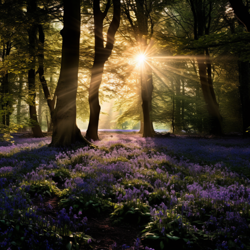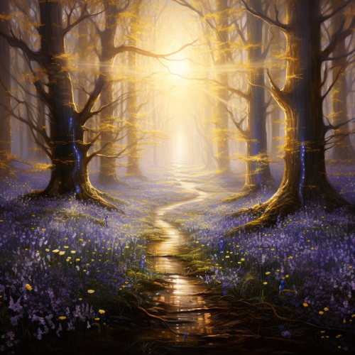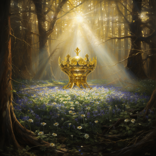 Golden crown lost in a bluebell forest, light streaming through the trees, 4K, painting