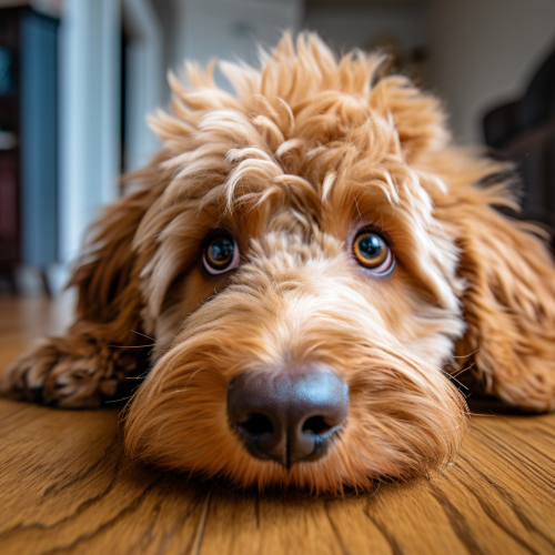A photo of a happy and excited golden doodle puppy, sitting on the floor in front of its owner and looking up at them with excitement, opened his mouth and is about to bark, taken indoors with natural lighting, shot with a Canon EOS R5 at F2, ISO 400, and 3mm focal length