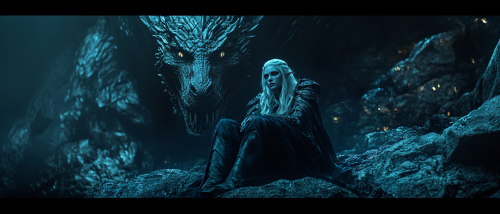 dark elf Sylvanas Windrunner from World of Warcraft resting on the rock in dark cave on spotlight looking to the camera with big dragon head behind her, dark blue atmosphere with magical shadows uhd natural --ar 7:3