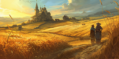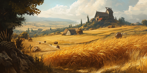 Depict a medieval farmland on vast plains, focusing on golden wheat fields stretching to the horizon. Include farmers both in the foreground and background, seamlessly integrated into the scene. The artistic style should be reminiscent of Marc Simonetti, known for his detailed and atmospheric compositions, capturing the rustic charm of the medieval period. Highlight the natural beauty of the plains and the rich golden hues of the wheat, creating an image that evokes a sense of tranquil, pastoral life. --ar 2:1 --v 6.0