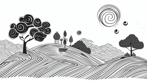 geometric figures of chinese ancient farmland, etching, thick line outline, minimalism, convex plate printing, Flat style illustration, retro, black and white, artistic, white background, clear outline --ar 16:9 --v 6.0