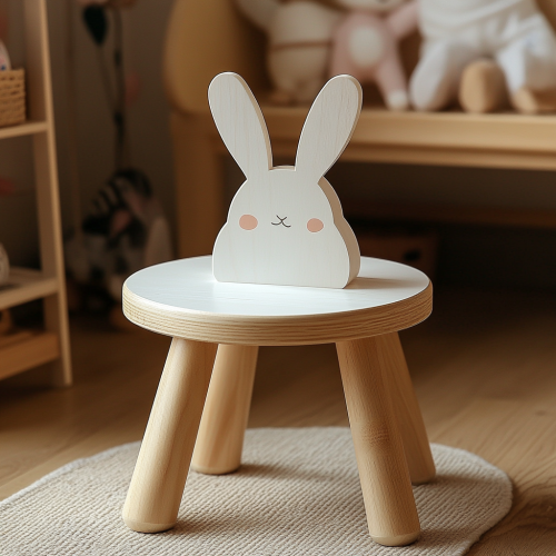 Cute rabbit style, small round stool for children, solid wood color, reserved space for sitting, the backrest is cute rabbit ears or cute rabbit head, the backrest is at the back of the chair