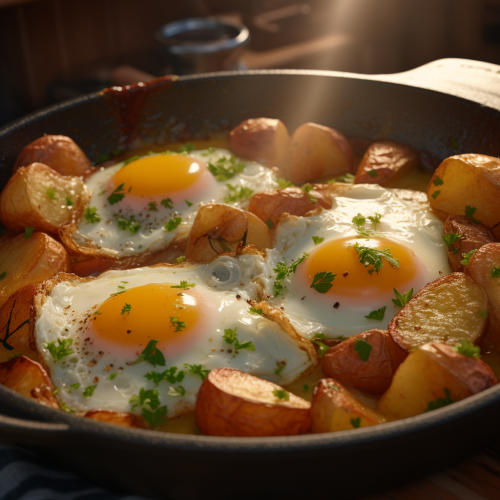 Create a high-quality image of a luxurious copper frying pan with a polished finish, showcasing its reflective surface. Place the pan on a wooden kitchen counter with fresh herbs and vegetables artfully arranged around it. The background should be softly blurred to emphasize the pan’s craftsmanship.