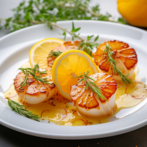 Professional Food Photography of a Baked Scallops Dish. Capture the exquisite essence of a perfectly baked Scallops dish, showcasing its tender and flavorful profile. Position the medium-sized portion of Baked Scallops in the center of a clean, white plate. Emphasize their perfectly cooked texture and delicate flavors. Gently sprinkle a touch of lemon zest on top of the Scallops. Artfully place two lemon slices on one side of the plate to enhance the visual appeal. Arrange a portion of asparagus on one side of the plate, providing a vibrant and complementary element. On the opposite side, position a modest serving of jasmine rice, elevating the overall presentation. The dish is set on a pristine white plate to create a simple and elegant backdrop. Recreate the ambiance of a tasteful yet reasonably priced restaurant, ensuring there's ample lighting to accentuate the dish's textures and colors. Additional Notes: Pay close attention to the Scallops' succulent texture, showcasing their tenderness and natural sweetness. Strive for a balanced composition that highlights the harmony between the Scallops, lemon, asparagus, and rice. Aim for a professional-quality photograph that captures the sophistication and delectability of our culinary offering.
