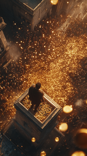 STYLE: Cinematic Shot | GENRE: historical drama | EMOTION: detachment, fascination | SCENE: Heliogabalus stands atop a tower, casually tossing gold coins to the crowd below, his face a mask of detached amusement as he watches people scramble for the riches. The sun glints off the coins, casting a warm, surreal glow over the desperate crowd. | TAGS: 8k, warm golden light, intense realism, immersive historical detail, cinematic extravagance | TIME: Late afternoon | LOCATION TYPE: Tower overlooking the crowd | CINEMATOGRAPHER: Emmanuel Lubezki | --ar 9:16