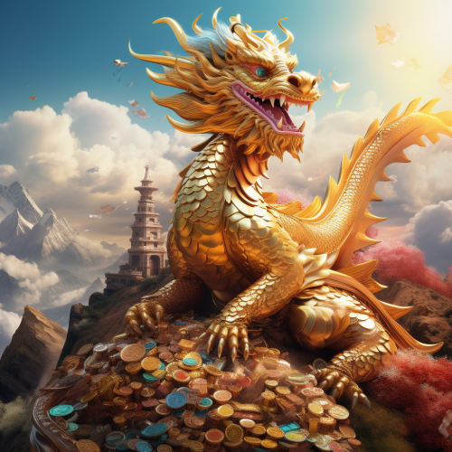 3d, high in details, full body of a majestic golden Chinese dragon with rainbow feather, resting on a mountain full of golden ingots, gold bar, gold coins, beautiful sky, long shot, 32k