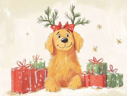 illustration of a Golden Retriever is lying at the base of the Christmas tree with a mischievous expression, and the tree is starting to tip over as if the dog has just bumped into it, drawn in the style of Oliver Jeffers, soft light, pastel colors, Christmas theme, childrens book illustation --ar 4:3 --v 6.1