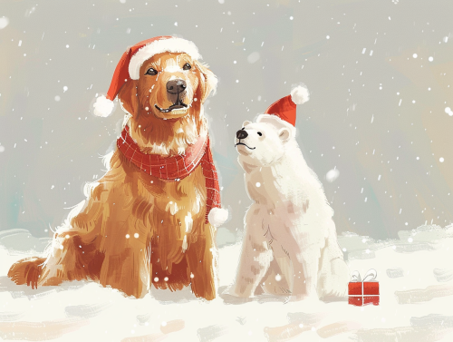 illustration of a Golden Retriever with a santa hat and scarf sitting upright with a Polar Bear with a santa hat and scarf sitting beside him, snow, drawn in the style of Oliver Jeffers, soft light, pastel colors, Christmas theme, childrens book illustation --ar 4:3 --v 6.0