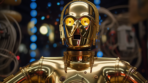 A highly detailed, straight-on, centered portrait of C-3PO from Star Wars, positioned slightly lower in the frame to enhance his presence. His reflective golden plating is rendered with intricate detailing, showing the scuff marks and wear of countless adventures. His bright, expressive photoreceptor eyes are fixed directly at the camera, exuding a hint of nervous curiosity and loyalty. The joints and mechanical components around his neck and torso are slightly visible at the bottom of the frame, ensuring all focus is on his iconic, inquisitive expression. The background features a warm, softly illuminated spacecraft interior with subtle hints of circuitry and metallic textures. Dim lights cast soft glows and reflections on his polished gold armor, adding depth and realism to his appearance. Delicate particles float in the air, capturing the bustling, high-tech ambiance of the Star Wars universe. Every detail of his plating and expressive design conveys both the vulnerability and resilience of this iconic droid – massurrealism, intricate details, clear features, global illumination Nikon D850 DSLR 200mm f/1.8 lens, f/2.2 aperture, 50k, 3D, UHD, rtx on --v 5.1 --s 1000 --ar 16:9