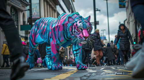 a blue and pink tiger walking down busy street people look shocked to see it there avoiding it walk london street cloudy day tiger is bright and elegant looking --ar 16:9 --v 6.0