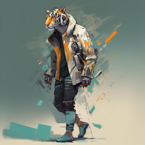 abstract, cubism, cyber punk jacket,mechanic ear, bipedal walking tiger, full-body shot, low angle --v 6.0