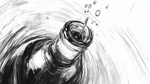 storyboard illustration extreme close up shot looking up into a water bottle as a single drop falls towards camera, concept art, storyboard, black and white, pencil drawing, --ar 16:9 --v 6.1