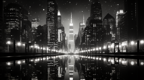 Christmas in the city. Neon. Black and white. Stylish. High-end. Important. Mysterious. Shot with a Pentax. K-3 III Monochrome. Extreme low angle shot. --no people - --ar 16:9 --q 0.5 --s 750